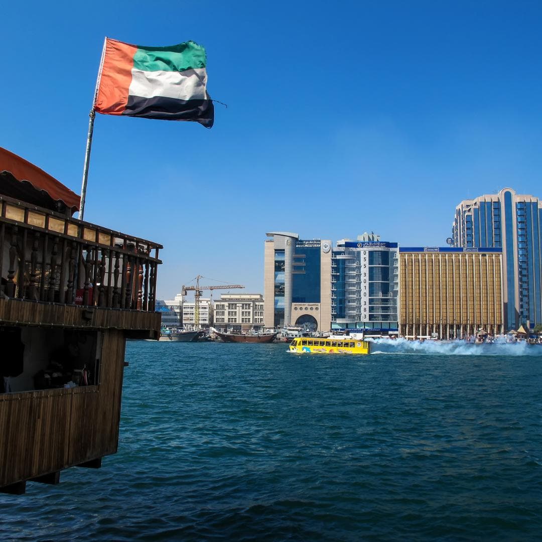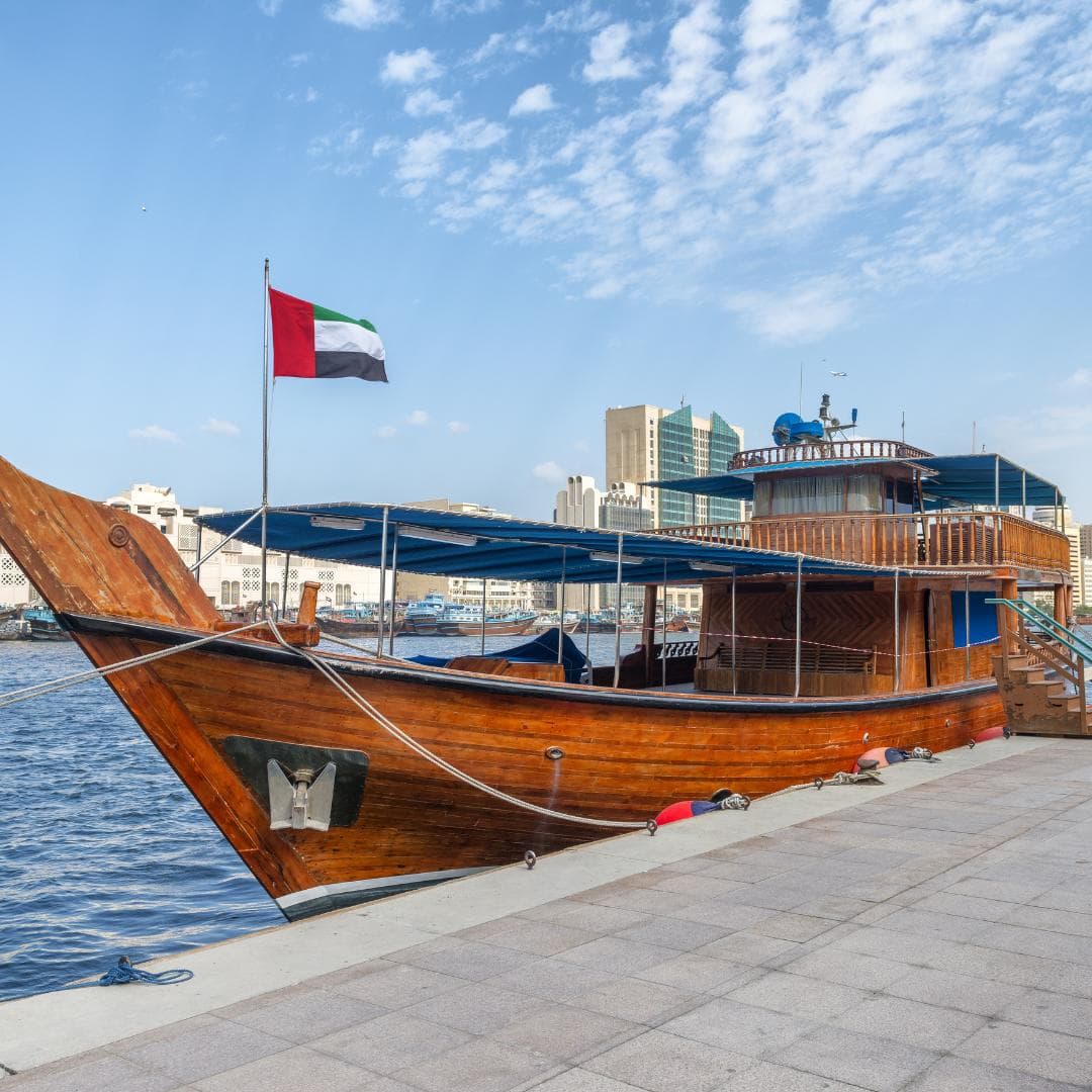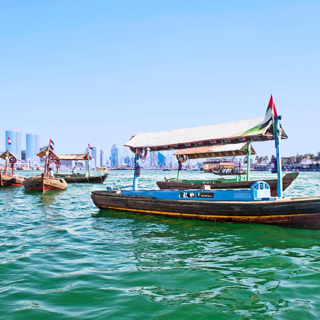 Unsere virtuelle Reise endet mit einer Bootsfahrt auf dem Dubai Creek. Der 14 Kilometer lange Meeresarm bietet eine entspannte Möglichkeit, Dubais beeindruckende Kulissen aus einer anderen Perspektive zu erleben.